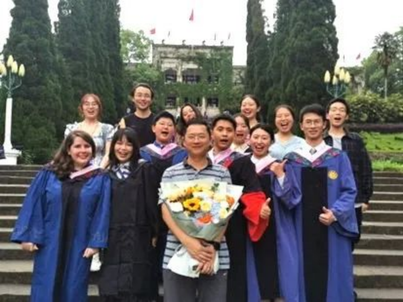 和学生们合影,手拿捧花者为何清华