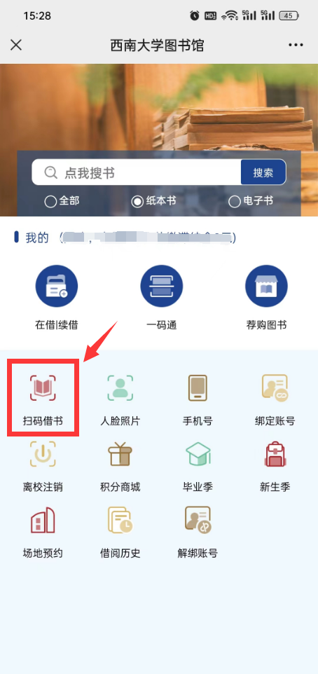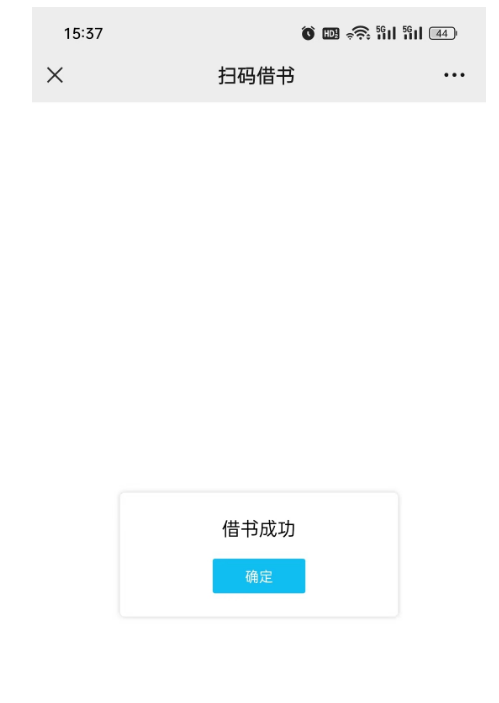 2.绑定成功后,点击“菜单栏-我的-扫码借书”,用手机扫描图书扉页条形码(一般位于图书翻开第一页或第二页),出现提示信息“借书成功”即表示完成借阅手续。操作界面示意图如下: