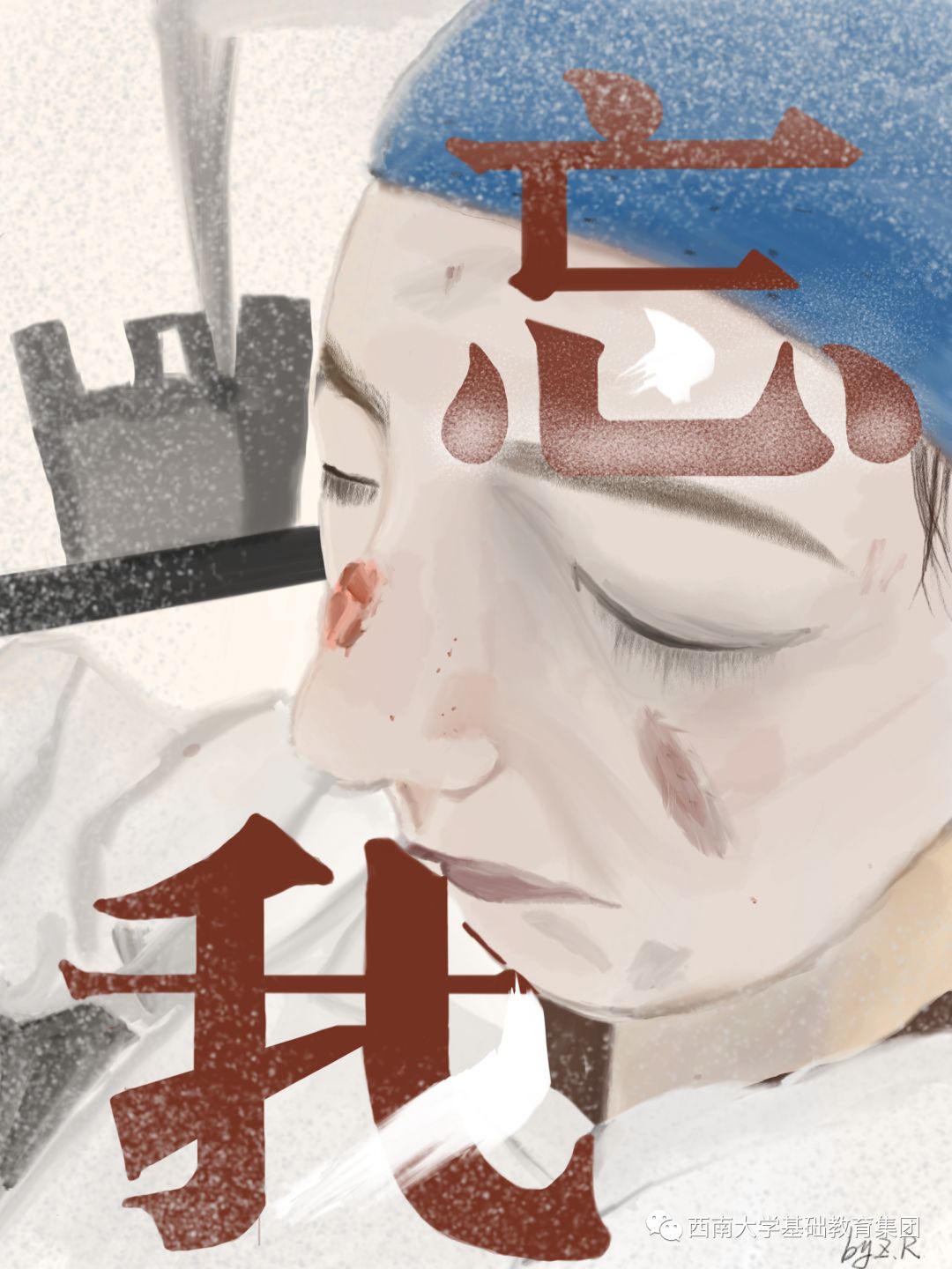蒋老师的这幅作品将视角放在了保护野生动物上面,以四分之三满构图的方式特写了人物的侧脸,并为该人物戴上了一个铁链与玻璃构成的口罩。该道具看似是保护,实则是束缚,衬托出真正的保护要从与自然和谐的可持续生活开始。画面艺术感强烈,人物情感传达到位。