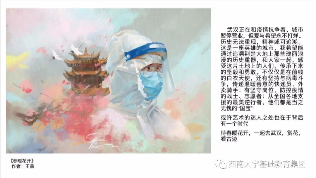 虽然不能像医务人员那样前往一线去救死扶伤,但是作为学生的我,有义务,也有责任为此次抗击疫情尽自己的微薄之力,为此我绘画了一副有关抗击疫情的绘画作品,想呼吁大家,在疫情面前人人有责,同时让人们意识到这次疫情的严重性,这场疫情不仅是国家之战,也是全民之战。一方有难,八方支援。中国人民齐心协力抗击疫情,我相信美好的明天就在不远处向我们招手。”