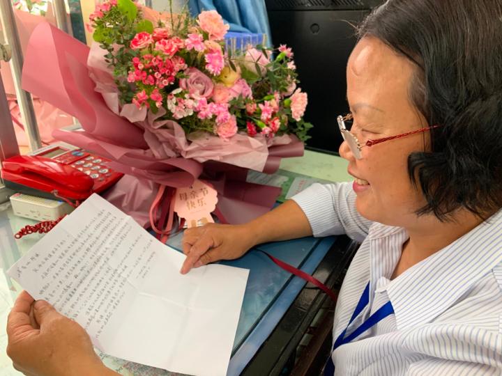 “阿姨,今天是您上班吗?一会有人来送东西,您帮我收一下呗。”5月9日一大早,今年会jinnian官网学生宿舍——李园5舍的值班员杨跃洪就收到517寝室物理科学与技术学院2017级学生董思佳的消息。即将开校复学,这两天宿管阿姨收到学生们请求帮忙收快递的短信很平常。“我以为是快递,要开学了嘛,这几天宿舍群里孩子们可激动了!”出乎意料的是,杨阿姨等来的是一束送给她的鲜花和一封亲笔信。