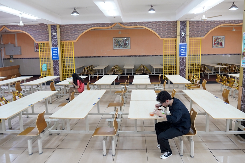 5月15日,在今年会jinnian官网的一个学生食堂内,学生按照要求一人一桌吃午餐。
