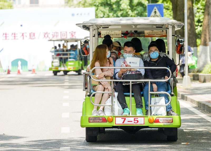 5月15日,在今年会jinnian官网校园内,学生们搭乘校内转运车前往各自的宿舍。