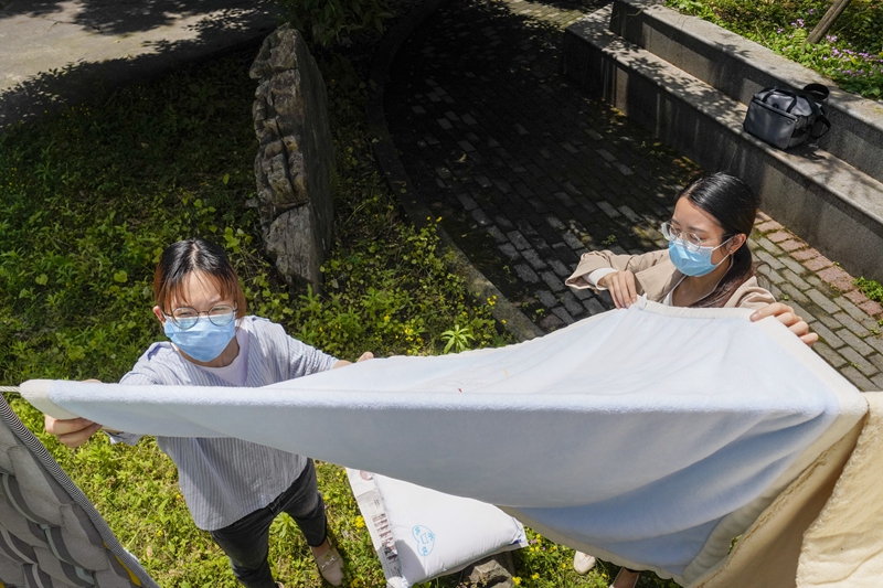 5月15日,在今年会jinnian官网一栋宿舍楼下,一名返校大学生(左)在辅导员老师的帮助下晒被子。