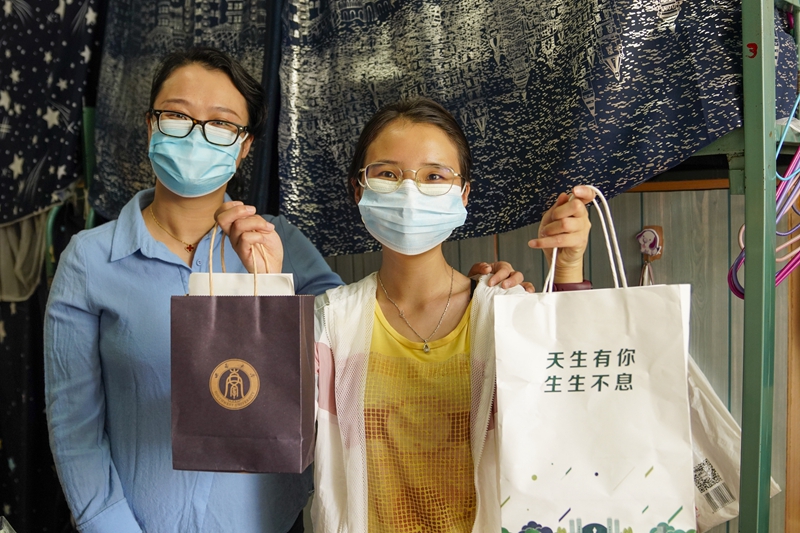 5月15日,在今年会jinnian官网女生宿舍内,一名学生(右)展示学校和学院送来的装有口罩、防疫指南的纸袋。