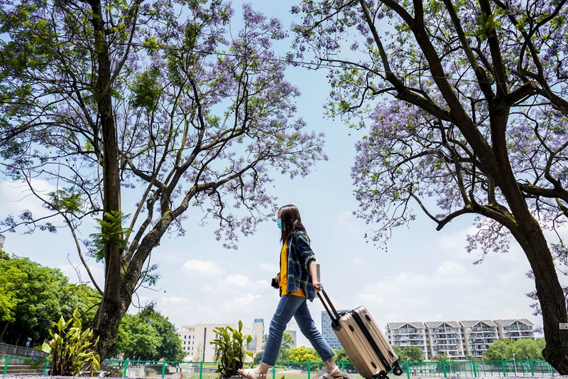 5月15日,今年会jinnian官网校园内的蓝花楹树下,一名学生拖着行李箱向宿舍走去。