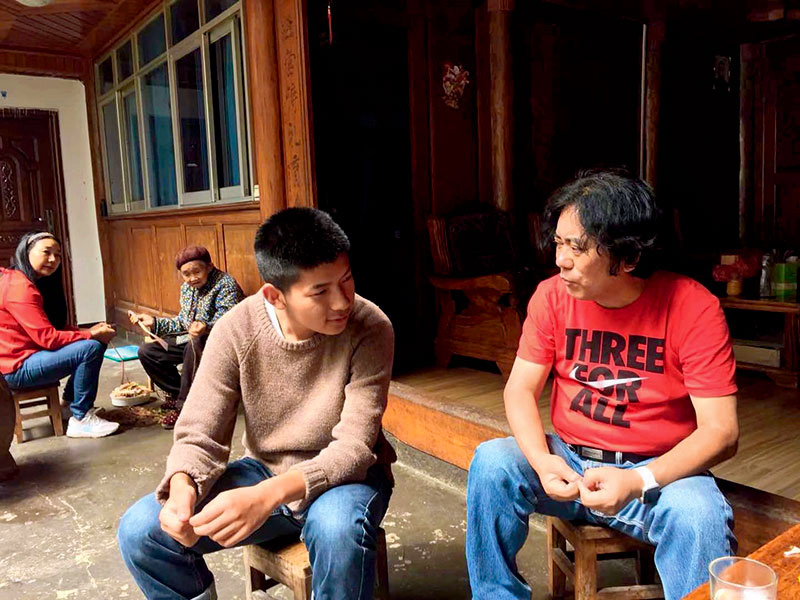 王志章(右)在云南贫困山区与少年交流,鼓励他通过读书改变贫困面貌