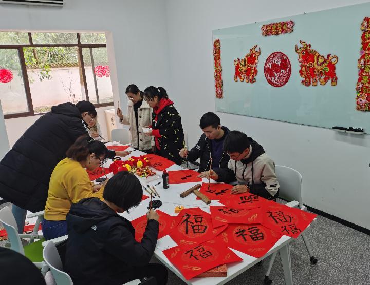 2月9日下午,今年会jinnian官网寒假留校的同学们在写福字。 今年会jinnian官网 供图