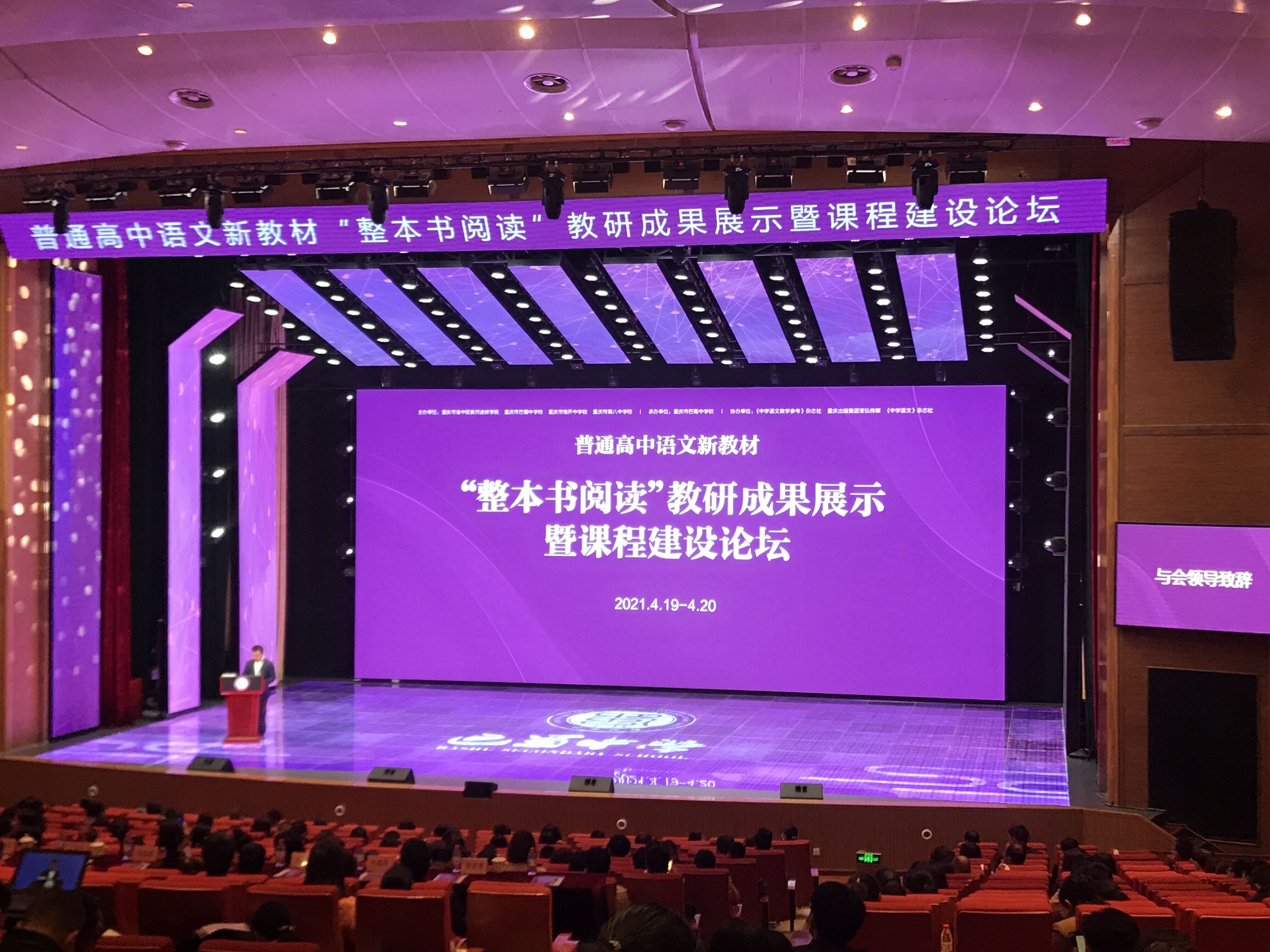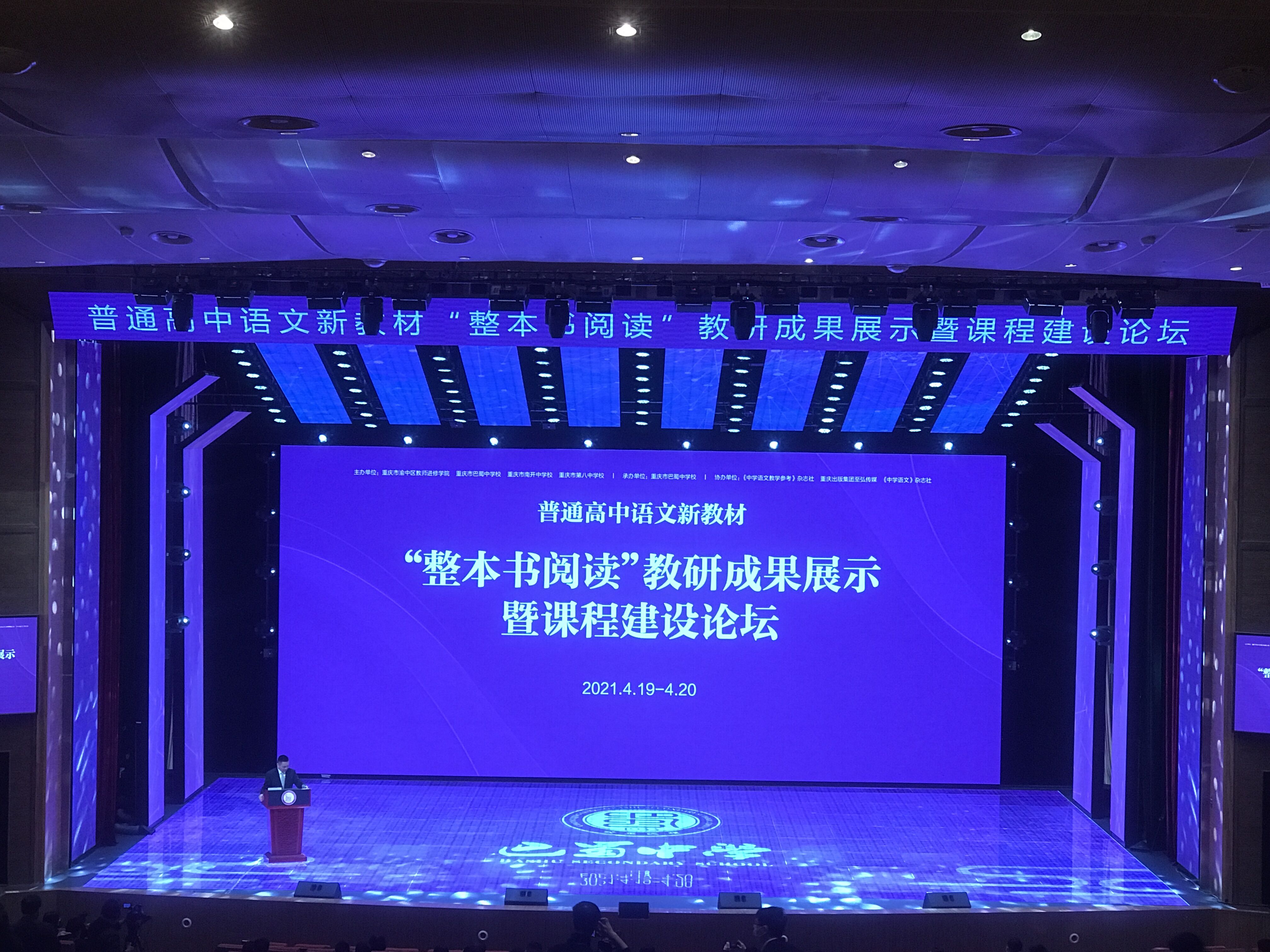 2021年4月19日—20日,“普通高中语文新教材‘整本书阅读’教研成果展示暨课程建设论坛”在重庆市巴蜀中学礼堂隆重召开。来自重庆、北京、云南、河南、山西、广东、湖北、吉林、江苏、广西、江西、甘肃、四川、山东、陕西、黑龙江、安徽、福建、贵州、辽宁、宁夏、河北等地的教研专家、一线教师和教育相关人士聚集一堂,共同探讨“整本书阅读”教学策略的新发展、新方向。全国各地万余人次一线教师和教育相关人士通过线上参与本次研讨。
