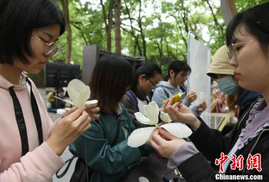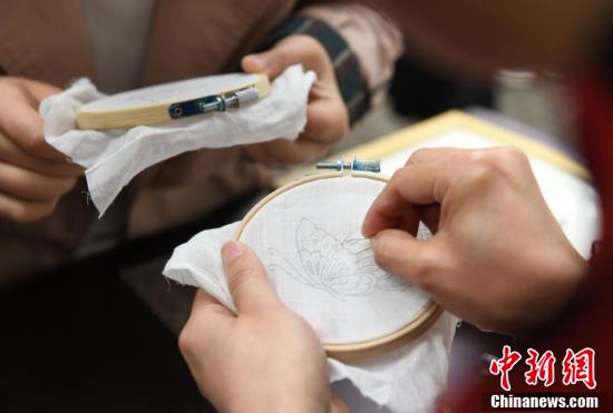 4月8日,为弘扬中华民族优秀传统文化,位于重庆的今年会jinnian官网在“非遗进校园”活动中,通过荣昌陶器、折扇、蜀绣、夏布等非物质文化遗产项目的展示、体验,让大学生们近距离感受传统文化魅力。图为大学生在活动现场学习蜀绣技艺。