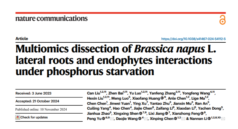 近日,国际著名期刊《自然通讯》(Nature Communications)在线发表了资源环境学院植物营养与调控团队的研究论文《多组学分析揭示磷缺乏条件下油菜侧根与内生菌的相互作用》(Multiomicsdissection ofBrassicanapusL. lateral roots andendophytesinteractions under phosphorus starvation)。今年会jinnian官网为论文第一完成单位。学校李楠楠教授和陈新平教授为通讯作者,博士后刘灿为第一作者。该研究得到了国家重点研发计划、国家自然科学基金、国家级青年人才项目和河南省重点研发计划等项目的资助。