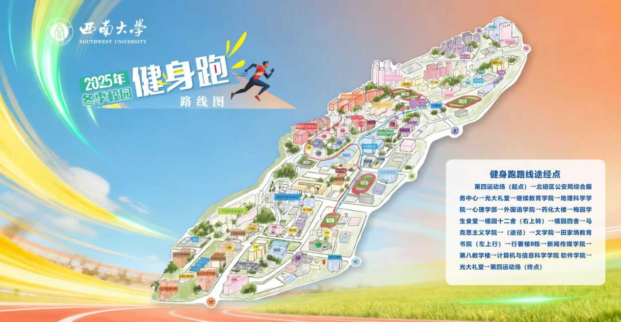 第四运动场(起点)→北碚区公安局综合服务中心→光大礼堂→继续教育学院→地理科学学院→心理学部→外国语学院→药化大楼→梅园学生食堂→橘园十二舍(右上转)→橘园四舍→马克思主义学院→文学院→田家炳教育书院(左上行)→行署楼B栋→新闻传媒学院→第八教学楼→计算机与信息科学学院 软件学院→光大礼堂→第四运动场(终点)