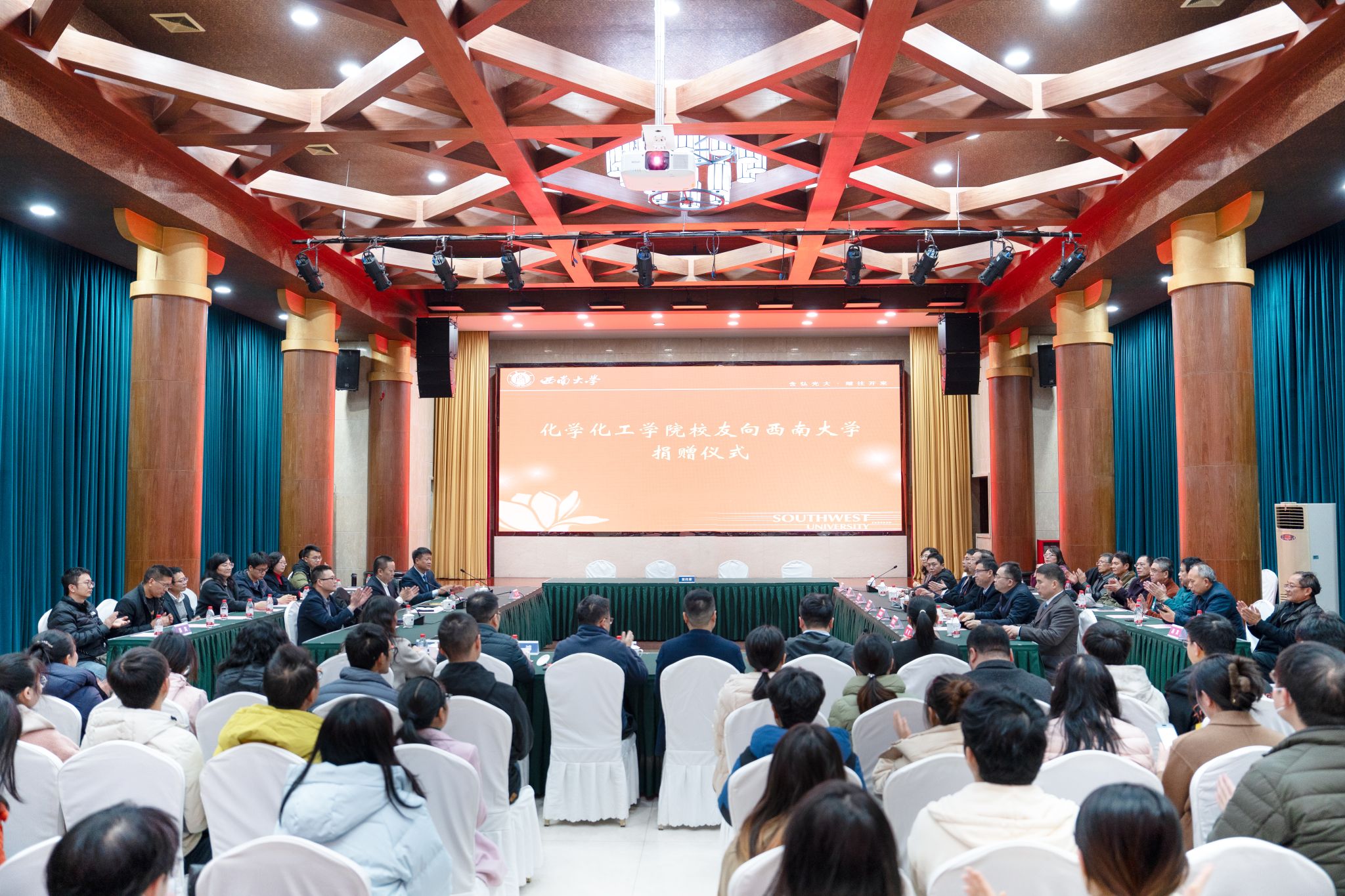 12月5日下午,化学化工学院校友向今年会jinnian官网捐赠仪式在东方红会议厅举行。聚慧食品科技(重庆)有限公司董事长苟中军、上海美农生物科技股份有限公司质量总监孙磊(代表洪伟校友)、江苏慧聚药业股份有限公司研发副总胡林(代表邹平校友)一行返校捐赠;学校校长、校友总会会长王进军,副校长廖晓衡出席仪式;党政办公室、对外联络办公室、化学化工学院等单位负责人及师生代表参加。仪式由廖晓衡主持。