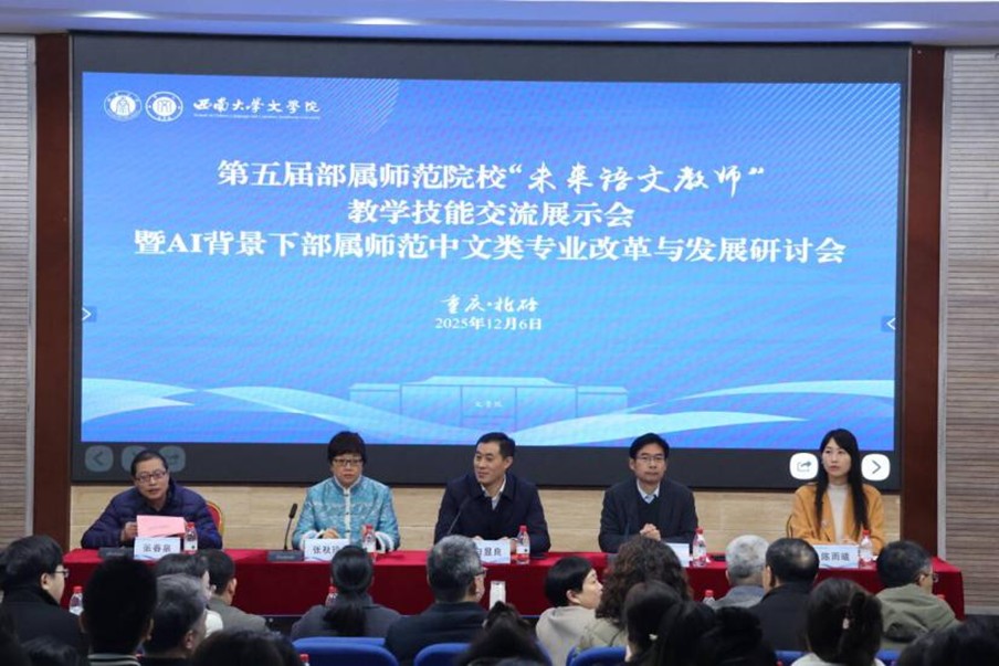 12月6日至7日,由六所教育部直属师范院校联合发起,学校文学院主办的第五届部属师范院校“未来语文教师”教学技能交流展示会暨AI背景下部属师范中文类专业改革与发展研讨会顺利举行。副校长白显良出席开幕式并致辞,来自六所部属师范院校与重庆市教育一线的专家学者和文学院相关负责人参加。