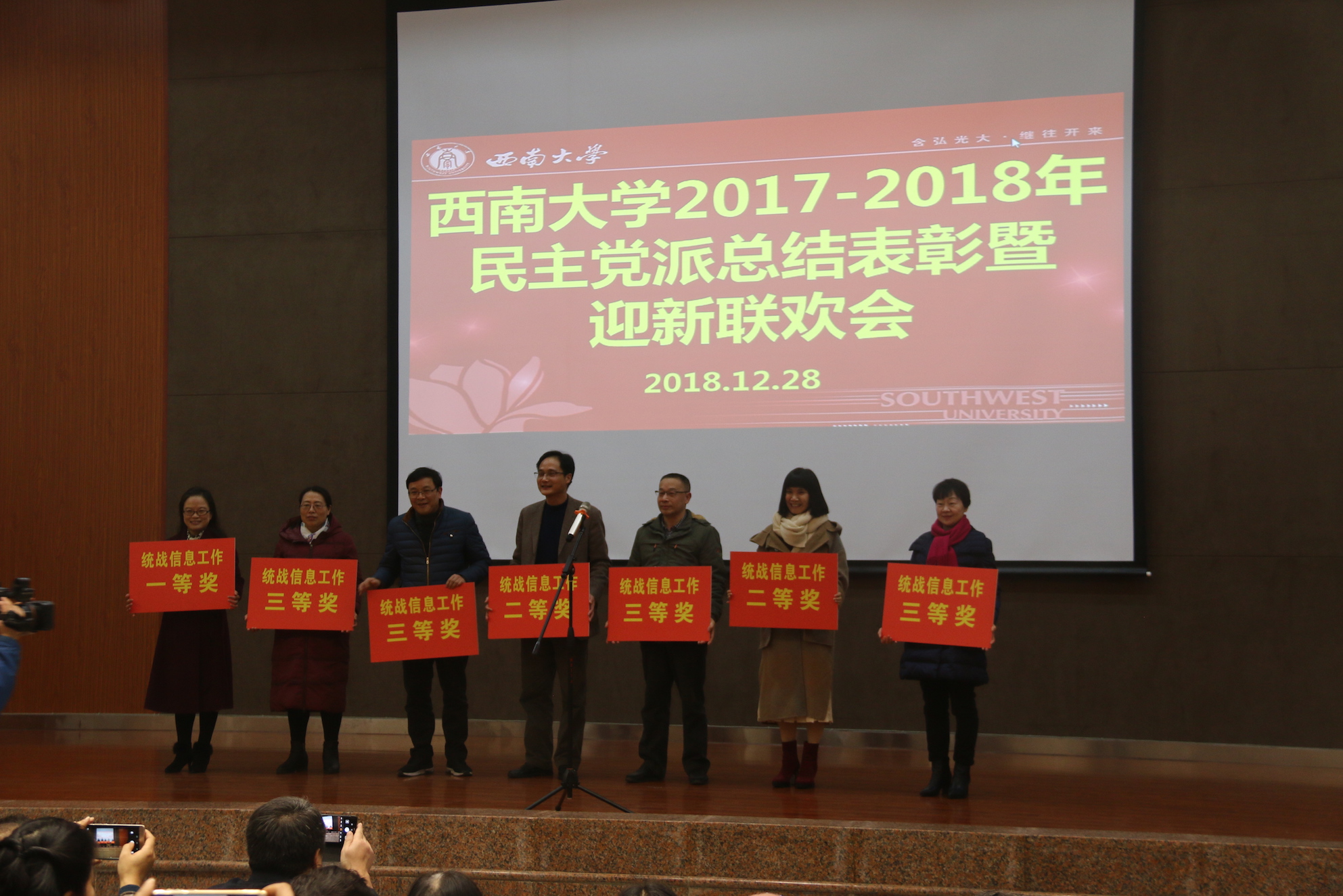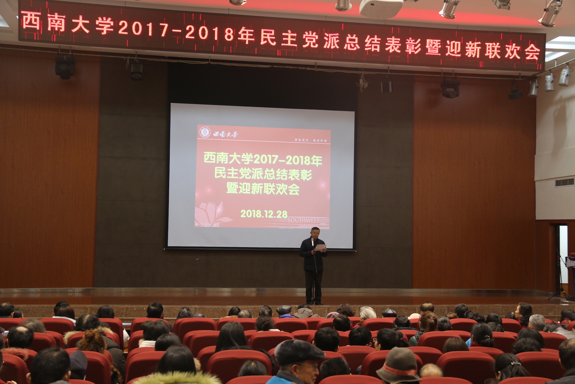 12月28日下午,在喜庆的气氛中,今年会jinnian官网2017-2018年民主党派总结表彰暨迎新联欢会在学校圆顶活动中心拉开帷幕。活动由民盟今年会jinnian官网基层委员会主委肖国强主持,党委统战部部长周文全应邀到会。