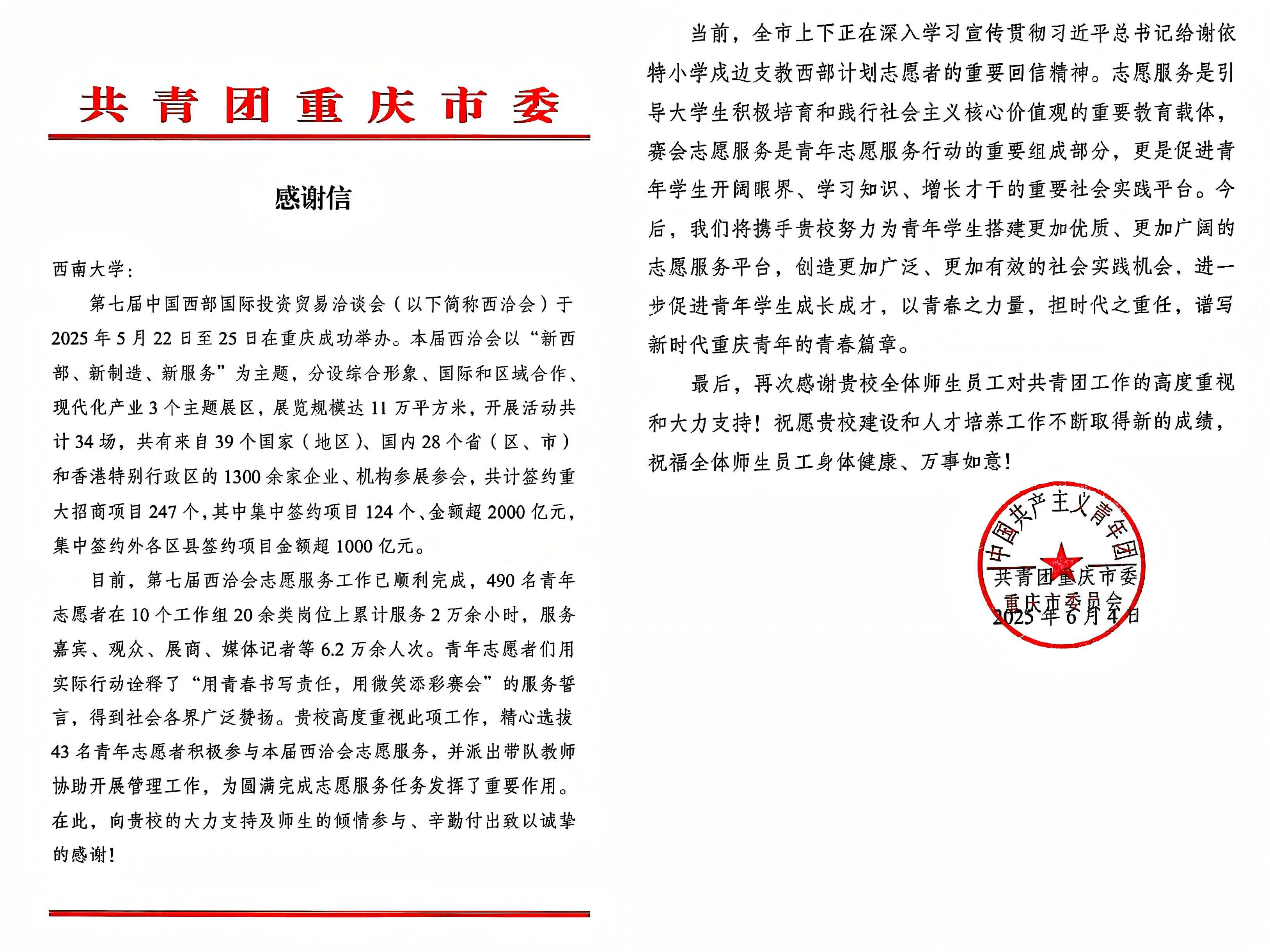 近日,共青团重庆市委向学校发来感谢信,感谢“西小兰”志愿者为第七届中国西部国际投资贸易洽谈会(以下简称西洽会)做出的突出贡献。信中指出,志愿服务是引导大学生涵养和践行社会主义核心价值观的重要教育载体,“西小兰”志愿者围绕语言翻译、礼仪接待、会场服务、新闻宣传等圆满高效地完成了各项服务工作,以实际行动践行了服务承诺,为这场国际性盛会的顺利举办提供了坚实支撑。